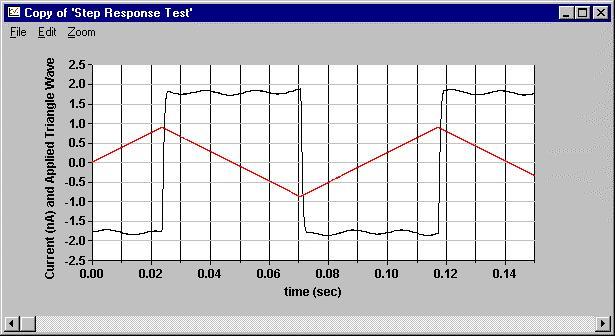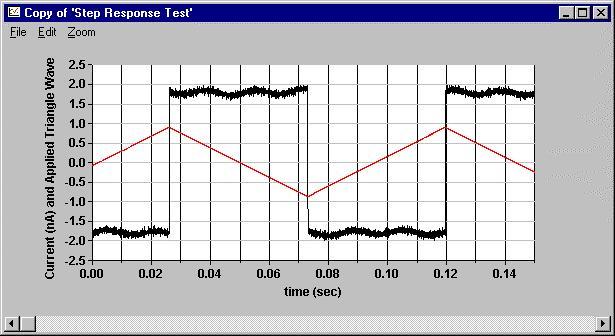 如果一个电容器和一个三角波串联,产生的电流会是一个方波。这一技术被用来向被评估的仪表发送一个方波:6487,6485和428. 一个轴向电容(50pf)被放在一个屏蔽的BNC接头盒里(例如Pomona型号3231)。一个来自函数发生器的10赫兹的三角波通过电容器被送入仪表的输入。从BNC到三同轴适配器被用来为所有连接最大化三同轴电缆的使用。一块KPCMCIA-16AIAO-C卡被用来为来自仪表的模拟输出信号采样,也包括进入电容器的三角波。这样可以比较相对于施加激励的输出的响应时间。每信道采样率是50赫兹,对于KPCMCIA数据采集卡,增益取为1。