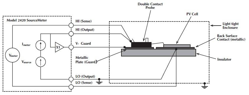 图2是用以进行暗态反向I-V特性测试结构图。如果所要测量的暗态反向电流大于1μA,那么无保护的4线结构就可以产生精确的结果。当暗态反向电流小于1μA时,电缆和夹具中的分布漏电流可以对测试产生误差和噪声。有两个方法可以用来降低或消除这些误差源。第一个方法是采用高电阻材料构建测试夹具,而且要保持夹具不受污染。第二个方法是采用2420型源表的内建保护电路。