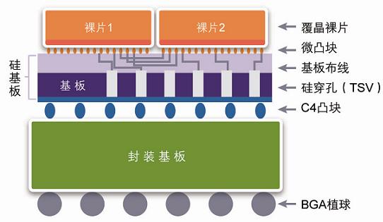 图1:2.5D集成(两块裸片通过穿过硅基板的导线进行互连)。