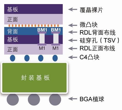 图2:3D-SIC(两块堆叠裸片通过TSV进行互连)。