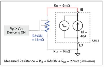 有些功率器件的导通电阻阻值在几个毫欧。因此,引线电阻与待测参数可能在同一数量级。当施加大电流时,这些阻值不大的引线电阻可能带来电压误差。在电压测量中的很小偏移或噪声,也可能给导通电阻测试结果带来很大的误差。