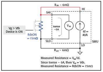 在大电流测试中,为了对低电压和低电阻进行精确测量,必须采用4线连接——又称作开尔文连接。为了保持良好的测量,必须监控力引线电阻,以避免力引线和检测引线之间的最大电压降超过源测量单元(SMU)的性能指标。