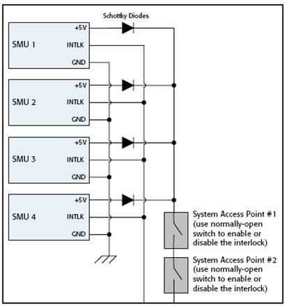 所有仪器的5V电源都是组合的,从外部通过开关连接,并用于启动互锁。当使用多个源测量单元(SMU)的5V电源时,可以使用肖特基二极管,以防止每个源测量单元(SMU)的5V电源彼此后驱动。肖特基二极管是首选,因为它们具有较低的正向电压;因此,它们不太可能影响启动互锁线路所需的电压。
