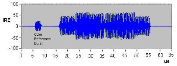 您可以看到左边的信号色彩突发。点状模式代表了正弦节拍的强度图,构成色彩突发波形。在解码之后,色彩突发看上去像是单色的表面(如果在电视显示器上可见)。