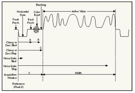 水平同步(HSYNC)信号示每条新的视频行的开始。其后是后沿,用来作为从浮地(交流耦合)视频信号去除直流分量的参考电平。这是通过单色信号的钳制间隔实现的,它出现在后沿中。对于合成彩色信号,钳制发生在水平同步脉冲中,由于大部分后沿用于色彩突发,它提供了信号色彩成分解码信息。在MAX帮助中,视频信号的所有设置参数都有较清楚的描述。
