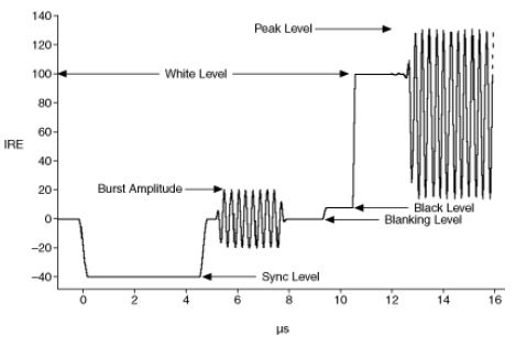 说明:大多数行从水平同步脉冲开始,随后是色彩突发模式信号。之后的活动图像(或ITS)显示强度变化,其中较高的信号电平代表更高的亮度。