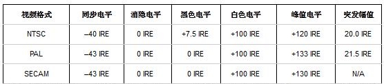 对于NTSC而言,通常应用7.5 IRE设置,将黑色电平提高为+ 7.5 IRE。对于PAL和SECAM,黑色电平与消隐电平一致,均为0 IRE。