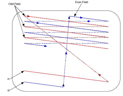 两个交叉场合成一个完整帧。第一个场称为奇数场,对视频图像的奇数行进行扫描。第二个场称为偶数场,对视频图像的偶数行进行扫描。整个过程对每帧进行重复。