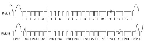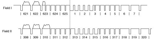 水平同步脉冲一般是简单的负脉冲,这些脉冲电平低于亮度信号电平。但是,垂直同步信号由分步在多行上的脉冲序列构成,脉冲序列对于奇数场和偶数场而言是不同的。图8和图9显示了用于两种场和三种主要视频格式的垂直同步模式。
