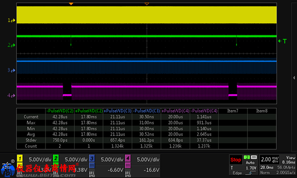 2)若脉宽正常时,可通过区间测量统计计算周期数,分析各个大小周期信号直接的相互包含关系,检查时序参数;