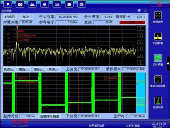 上面说的发射机测试和接收机测试大部分是针对模拟电台的测试,那么跳频电台的测试就需要用到实时频谱的功能了。AV4945B/C提供了实时频谱功能选件,可支持带宽为60M的实时信号分析,可以以瀑布图、频率时域、幅度时域等多种形式显示实时信号频谱含量。