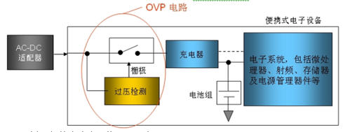 根据YD/T 1591-2006标准,手机侧充电控制电路应具备过压保护装置,也就是在手机充电接口导入直流6 V以上电压时,如果不能保证安全充电,应启动保护,在非预期电压的情况下,不应出现过热、燃烧、爆炸以及其它电路损坏的现象,而且恢复后,手机应能正常工作。如图4所示,过压保护(OVP)电路在检测到过压故障状况时,检测电路就会将开关打开,使电子负载与电源断开,从而使得包括微处理器、射频、存储器和电源管理器件等核心芯片遭受过压损伤。