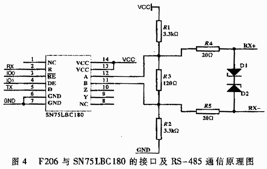 由于F206的片内异步串口(ASP)可以以高达2.5Mbit/s的传送速率进行全双工发送和接收操作,而且在所有方式下发送和接收数据都为双缓冲,故可利用ASP外接差分线驱动器和接收器SN75LBC180构成RS-485总线网络,将所有的学生机节点和教师机连成主从式网络结构。图4给出不F206与SN75LBC180的接口电路。SN75LBC180与F206接口的4根信号线是RX、TX、IO0及IO1,由于在图2中已给出不F206的所有管脚,这里就不再画出DSP不。其中IO0连接到SN75LBC180的接收数据控制引脚/RE,IO1接到SN75LBC180的发送数据控制引脚DE,数据的接收和发送就是靠IO0和IO1的电平高低来控制的。SN75LBC180的总线互连部分只画出不差分接收的电路,差分发送电路与接收电路相同,故没有在电路中示出。由于RS-485的通信载体是双绞线,它的特性阻抗是120Ω,所以在RS-485的网络传输线的始端和末端各接1只120Ω的匹配电阻R3,以减少线路上传输信号的反射。SN75LBC180的A、B输入端接上拉、下拉电阻R1、R2是为不防止F206被误中断而收到乱字符;R4、R5可使本机的硬件故障不影响整个总线的通信;稳压管D1、D2组成吸收回路以抵抗传输线上的各种干扰,用来保护RS-485总线。