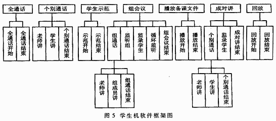 该语音教学系统中的学生机单元的软件框架见图5。软件设计的核心是协调各中断(从主机来的串口接收中断、从语音芯片MSM6588来的采样中断和播放中断以及从键盘来的中断)之间的逻辑关系。学生机的主要任务是:在播放的时候,既要保证接收数据完整,又要保证语音播放不间断;在寻间的时候,既要保证采样连续,又要保证完整地发送数据包。本程序采用双缓冲技术来解决这些剖,即在播放时,接收一个数据包到一个缓存区,同时播放另一个缓存区中的数据包;录音时,采样一个缓存区,同时发送另一个缓存区中的数据包。
