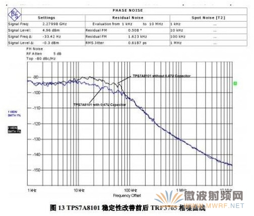 针对修改前后的设计,我们对比测试了相应的TRF3765相噪曲线,如图13所示,由图可见,增加0.47 ?F输出电容后,1KHz到10MHz的RMS抖动由0.62ps提高到0.49ps.