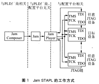 Jam STAPL是Altera公司提供的支持STAPL的套件。使用Jam STAPL进行配置包含两部分,Jam Player(Jam解释器或者称为Jam虚拟机)和Jam配置文件。Jam Player运行在微处理器中,读取Jam文件并解析Jam文件表达的内容,在JTAG接口上产生用于配置的二进制数据流并读取反馈数据。