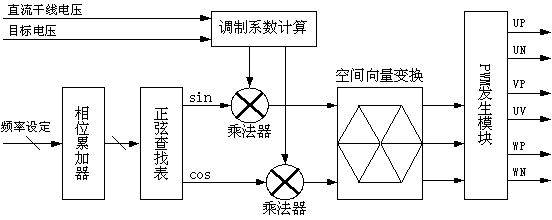 整个系统软件分为三部分:1.核心的波形发生器,这部分主要是SVPWM信号发生器,和一些相关的驱动服务程序;2. 系统控制程序;3. 人机接口界面程序;该系统核心的波形发生器部分的结构如图 5-1。在这里根据本系统的特点使用化简的SVPWM信号发生器结构。这部分结构(除PWM发生模块)将在PWM的周期中断中用软件实现。这里的调制系数计算和乘法器主要是为实现波形的幅度控制和电源波动补尝用的。