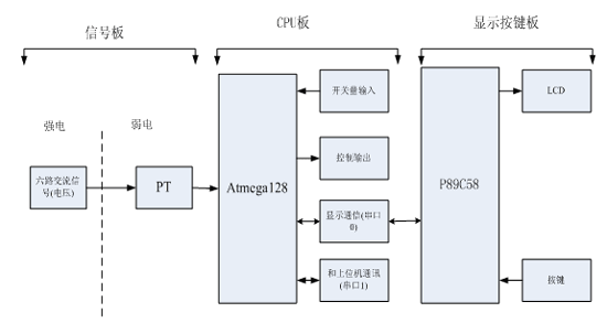 作为准同期装置,首先必须要准确地测量系统侧和待并侧的同期参数。也就是精确测量两侧的电压、频率,以及相位差。在这个基础上,装置要进行准确的同期动作以及和上位机的通信。因此,系统的硬件设计和软件流程围绕这三个方面展开。为了减少干扰和便于操作,硬件分为CPU板、信号板和显示按键板。下面的硬件框图清楚地表示了三者之间的连接关系和信号的流动情况。