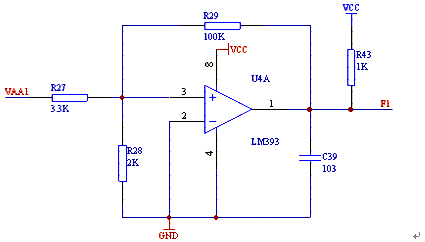 ATMEGA128单片机的定时器1和定时器3具有输入捕获的功能。因此频率(周期)的计算可以完全依赖硬件来实现。只需要设计一个转换电路将正弦波变换成为方波即可。方波两个上升沿(或下降沿)之间的时间间隔即是系统侧或对象侧的周期,这样就可以准确地测量出周期。注意,定时器1和定时器3中的计数值尽量不要采用软件清零。笔者刚开始的思路是每隔一次输入捕获中断将TCNT1或TCNT3的值清零,然后下一次的计数值乘以计数间隔时间就是系统侧或是对象侧周期长度。但是这样的办法很容易受到其他中断的影响。当外部事件发生的时候(上升沿或下降沿来到),硬件自动将计数值捕捉到相应的捕获寄存器,但如果此时有更高级中断同时到来的话,就必然会推迟一会才可以进入输入捕获中断程序,则软件必然会推迟清零,因此所测的周期会偏小、频率会偏大。特别是当更高优先级的中断程序执行时间较长时,所测周期根本无法使用。正确的做法是:在初始化时将定时器1和定时器3按照同样的分频系数同时开放,然后就不要对这两个定时器进行清零或其他操作。对于这两个16位定时器的溢出问题,可以通过在定时器1和定时器3的溢出中断程序中设置分别的溢出标志来解决。本装置所设计的波形转换电路如图2 所示。VAA1为对象侧或系统侧经过初步处理的交流信号。