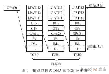 用户只需要在内存区填写多个TCB的表格,用其中的CPx字段将每个表格串起来并将第一个表格的结束地址放入CPx寄存器,就可以启动链式DMA。要终止一个链式DMA,只需要把最后一个TCB中的CPx字段填0即可。TCB结构如图1所示。