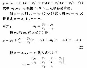 式中K0,K1,K2为待定系数,可用曲线y=f(x)的3个点A,B,C的二元一次方程组求解,这就需要解联立方程组,计算较复杂,列出的程序也较复杂,因此可以用另外一种型式:
