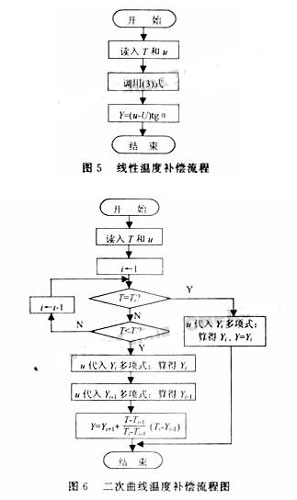 式中U是温度直线在坐标上的截距,可用线性插值由输入的T求得,α是温度直线与纵坐标轴u的夹角。按图5流程编制补偿程序,并作为子程序与监控程序一并使用,以便采集数据时按流程图自动温度补偿。