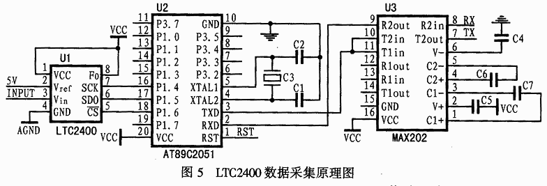 利用LTC2400实现高精度信号采集功能的系统原理图如图5所示。在该数据采集系统中,LT2400芯片的外围电路十分简单。AT89C2051单片机作为控制器,其中P1.4、P1.5和P1.6与LTC2400的SCK、SDO和CS相连,数据转换结果也通过该串行口输出;该系统采用电压为5V的基准源;信号由LTC2400的VIN输入,输入的电压范围为-0.625~5.625V;转换速率为6.25PPS;数据通过AT89C2051的RXD和TXD并经MAX202进行电平转换后由串行口输出给上位机。