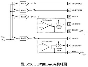 MSC1210的16位DAC是T型电阻网络型DAC,其内部结构框图如图2所示。输入DAC寄存器的值(D,取0~65535)与输出模拟量(VDAC)的关系为:VDAC=VREF*D/65536,其中VREF是DAC电压参考,可以选择内部REFOUT/REFIN+电压或电源电压AVDD,VREF与AVDD共同制约VDAC(IDAC)输入代码的范围,其关系如表1所示。DAC的轨-轨输出型缓冲放大器可以输出AGND~AVDD的电压,可以驱动2kΩ//1000pF的负载。加以外部电路,DAC也可输出±VREF的电压,例如图3所示电路,VO=VREF(D/32768-1)。