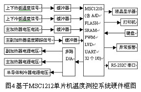 MSC1212实时测得冷热板温度并与用户设定的温度比较,结合PID控制和模糊控制算法,通过程序控制各路DAC输出一定的电压信号(0-5V),分别控制主副加热器电源电压(0-48V连续输出)、半导体制冷器电源电流(0-25A连续输出),电路十分简单,功率控制的速度和精度同时得到提高。