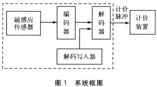 系统框图如图1所示,本文主要介绍虚线框内模块的设计。出租车驱动轮转数与转轴转数的传动比是一定的,而转轴转动时带动一小磁体转动,其传动比也是一定的,小磁体每转动一周就和磁感应传感器正对一次,磁感应传感器就会产生一个大约20 ms的低脉冲,可以通过计算磁感应传感器产生的低脉冲数来计算出租车跑的里程数及相应的车费。