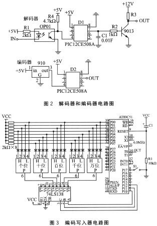 这部分采用的单片机是PIC12CE5C18,其内部有E2PROM。可以利用I2c协议随时从E2PROM中读出解码或者向E2PROM中写入新的编码。下面介绍工作过程。首先解码器读出内部E2PRoM中00h~04h中的5个十进制数据,分别保存到5个内部数据存储单元中。然后调用接收数据子程序,接收1个数据,并先保存到1个内部数据存储单元中,判断这个数据是否为区别字符10。若不是区别字符,说明现在接收的数据可能是编码器发送的编码,则继续接收后面的4个数据,并保存到4个内部数据存储单元中,将接收到的这5个十进制数据与前面解码器读出的内部E2PROM中00h~04h中的5个十进制数据进行比较,相等则在GP0引脚上发送一个2 ms的低脉冲作为计价脉冲,不相等则重新接收数据。若是区别字符10,说明现在解码写入器要修改解码器的解码,必须马上接收跟在区别字符后面的5个