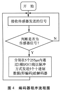 编码器部分使用的单片机为PIC12C508A,利用PIC12C508A芯片的第4个引脚GP3来检测传感器的输出信号。当检测到确定的传感器信号后,单片机将按一定的时序在其第7个引脚GP0连续发送5个十进制数据(即编码形式为5位十进制数)给解码器,每个数据都是按脉冲方式发送出去的。十进制数是多少,就发送几个低脉冲,发送一个十进制数据所用的时间要保证在255μs以内。其程序流程图如图4所示。