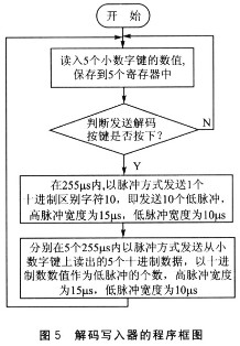 解码写入器部分使用的单片机为AT89C51,解码写入器的功能与编码器的功能类似。由于发送的解码要能随时改变,这里可以外接5个小数字键盘,解码写入器要发送的解码可以从5个小数字键盘上获得。为了和编码器发送的编码区别开来,解码写入器需要先发送一个区别字符,使解码器能够识别出当前接收的是编码器还是解码写入器发出的数据。区别字符后面紧跟着的是解码,所有这些数据的发送方式与编码器编码的发送方式完全相同,由AT89C51单片机的P3.4口输出,其程序流程图如图5所示。