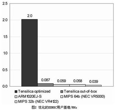 定制的处理器:定制的专用处理器将可有效替代硬连接逻辑功能块。图2示出用专用指令集定制处理器的性能效果,并对Tensilica Xtensa架构(T1050)的每MHz EEMBC用户基准性能与Xtensa的基础版本、ARM(64位方案)和MIPS(64及32位方案)进行了比较。定制的处理器快达50倍。