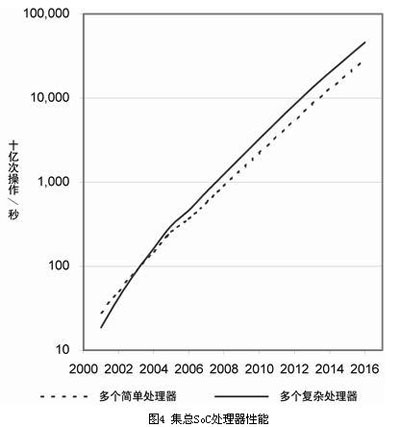 多个处理器的集总性能:SoC设计师将利用指令级和任务级两个并行性。专用处理器架构将利用指令级并行性,在单一种算法内,通过矢量(SIMD)和长指令字技术使吞吐量和效率大为增加。多个处理器自然利用任务级并行性。集成式开发工具和处理器生成器将使设计师可以研究由简单的增强型RISC处理器到庞大的长指令字矢量架构的各处理器的扩展范围,他们还将可以探查各种不同的处理器数量和系统拓朴。大量简单处理器和小量复杂处理器的模型产生了相似的整体吞吐量预测。吞吐量集总性能示于图4中(假定芯片面积为140mm2,处理器架构适度扩展)。在较小型简单扩展处理器和较庞大型数据并行处理器两种情形下,性能增长率(年增65%)及绝对值(1013操作/秒)是相似的。