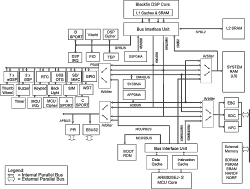 图1中的右上方是Blackfin处理器子系统,它由Blackfin处理器内核、L1代码存储器和数据存储器(可配置为高速缓存或SRAM)、统一的L2存储器、DSPDMA作为Blackfin DMA控制器,以及用于采集和处理GSM数据的DSP外设。Blackfin处理器子系统与系统总线接口单元(SBIU)交叉开关相连接。