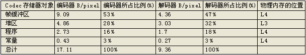 为了对视频编解码器内存储对象的布置作出最佳选择,也必须量化每个对象所需的数据带宽。表1给出了每个对象所需要的数据流量。例如,在解码器中帧缓存要求图像数据的每个像素具有4.36字节,这转换到QVGA分辨率的30 fps情况下大约是10MB/s,这大约是完整解码器所要求的总带宽的一半。堆区要求大约是6.7MB/s,或者是总带宽的32%。