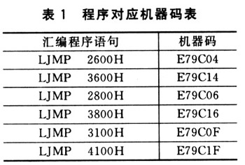 上述语句实际上代表的是LJMP2600H.其机器码为E79C04,当地址2600H变化时,得到一组对应的机器码,通过对这一组机器码进行分析,就可以得到该方法的原理,如表1所列。