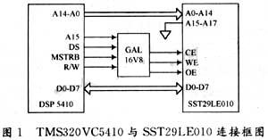 SST29LE010是SST推出的一种E2PROM,他有1 MB的空间,分为8页,每页有128 kB的空间;工作电压仅为3 V。因此用SST29LE0lO来作为TMS320VC5410的外部存贮器。SST29LE010与TMS320VC5410的连接见图1。