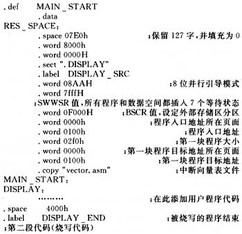 为实现在线并行引导,即把用户程序烧进E2PROM,需要把程序代码分为两段:一段为用户代码(即被烧写部分),另一段为烧写代码。用CCS把这两部分代码编译链接成同一个0UT文件(即COFF格式的文件),然后在CCS环境下将该0UT格式的文件下载到TMS320VC5410的内存中,此时TMS320VC5410内存里的文件已经转换成相应的Hex格式,此时只要从烧写代码处在线调试执行程序,即可把用户代码烧进E2PROM,从而完成自举表的烧写。由于TMS320VC5410的数据总线是16位,而SST29LE010的数据总线为8位,因此在数据传输过程中要进行移位操作。若采用16位并行引导时,则不用进行移位操作。