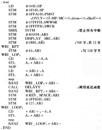 程序代码如上所述,分为两段,在编程过程中要注意在链接命令文件中.DISPLAY和.text在地址上不能覆盖。第一段代码为用户程序(包括自举初始化的状态字),即脱机运行的程序代码。本文的目的就是要把这部分代码烧写进E2PROM。第二段代码负责把第一段代码烧写进E2PROM。代码如下: