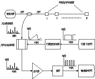 系统的控制核心还须控制布拉格光纤光栅传感信号的解调和对解调后信号的处理。用于布拉格光纤光栅传感信号解调的光纤法-柏分析器事实上是一个压控的光带通滤波元件,如果给布拉格光纤光栅传感器注入宽带光信号,将布拉格光纤光栅反射的窄带光加到光纤法-柏分析器的输入端,通过给光纤法-柏分析器的压控端加上一个三角形的扫描电压,则在光纤法-柏分析器的输出端即可得到一个与输入窄带光光谱相对应的时间域电信号。这个时域信号经过放大、整形,处理为一个系列脉冲信号,这个系列脉冲信号中的各个脉冲在时间域上的相对位置就包含了布拉格光纤光栅传感器反射的窄带光光谱信息。图1指示了这个解调过程。由于布拉格光纤光栅仅反射特定波长的光波,通过合理设计各传感器反射的中心频率,布拉格光纤光栅传感器可以串连使用。工程中一般设计成将多个传感器串连使用,这样,每个信号解调器就可以同时完成对多个传感器的解调工作。这也是布拉格光纤光栅传感器的另一个优点。