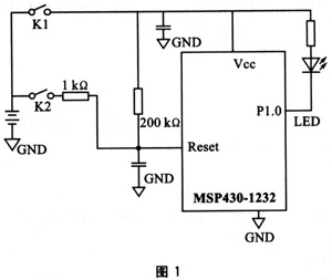 现今市面上流行的一些单片机,多嵌有内部WDT,如TI的MSP430系列,Philips的P87XXX和P89XXX系列,Microchip的PIC列,Atmel的AT89SXX系列和Holtek公司的Htxxx系列。但是这些内部看门狗在工作时,多存在一定的误差。一些工程师在设计的过程中,由于忽略了这一点,导致系统出现异常。MSP430系列单片机是美国德州仪器公司(TI)近几年开发的新一代单片机,该系列是一款16位、具有精简指令集、超低功耗的全新概念混合型单片机。在众多单片机系列中,由于它具有极低的功耗、丰富的片内外设和方便灵活的开发手段,已成为一颗耀眼的新星。其内部自带看门狗及复位电路,理论上如果程序跑飞,可用看门狗将其复位。但在实际使用过程中,发现看门狗的作用并非万无一失,以下实验证明了这一点。实验电路如图1所示。