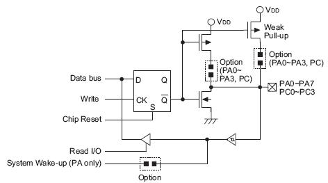 若PA、PC 口结构NMOS 时,在读取数据之前,必须向相关位写“1”以关闭场效应管NMOS 使其作为一个输入口。也就是说,要先执行指令SET [m].i 以关闭相关的NMOS,然后才能用MOV A,[m] 来读取稳定的数据。