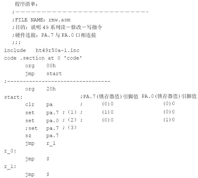 一些指令称为读-修改-写指令,该指令先读取引脚的值,而且是将八位引脚的状态全部读取,进行相应的位操作后,重写回锁存器中。这样,有些位的锁存器会因为该操作而改变原来的状态,致使再次输出时产生错误。例如,指令“SET [m].i”、“CLR [m].i”、“CPL[m]”、“CPLA[m] ”就是先将数据读取至CPU 中,然后进行定义的操作(位操作)后,再将结果写回锁存器或是累加器中。所以口在输入状态时执行此类指令,可能会使内部锁存的状态改变,需要加以注意。