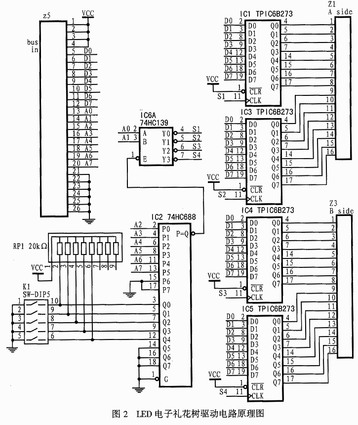 本电路的驱动电路原理图如图2所示。为了扩展方便,该电路系统采用插板结构,每个输出插板选用4个TPIC6B273作数据锁存和功率驱动,图中通过译码芯片74HC688、74HC393与跳线开关K1等完成地址选择、译码及TPIC6B273的选通和数据锁存工作。电子礼花树上的LED工作于动态状态,设其工作电流为45mA(3~4倍的静态额定工作电流),各色LED的平均电压为2.5V,各芯片的每一路输出可带动的LED为:2.5×20 ×3=150个,实际情况下,为了可靠工作,通常选择驱动一半数量(约80个)的LED驱动,这样,每个电子礼花树驱动板可驱动的LED为:80×8×4=2560个。该电路经长时间的工作实践检验,TPIC6B273工作可靠,系统工作性能良好。