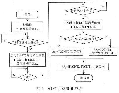 设置通用定时器T1的时钟输入为fs,并开通定时器中断,中断周期为转速的采样周期T,则定时器每隔时间T向CPU发送一次中断请求。利用光电码盘输出脉冲的上升沿启动采样周期定时器工作的同时,启动时钟脉冲计数器工作。测频中断服务程序如图2所示。