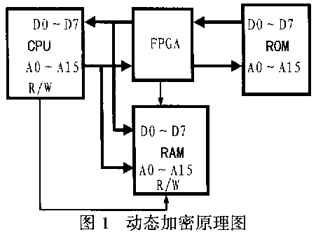 动态加密技术的主要思路是:在程序看到的是虚地址,而虚地址对应的存储器的实地址由CPU程序运行时通过FPGA赋予。其原理如图1所示。