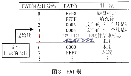 FAT是给每个文件分配磁盘物理空间的表格。FAT16簇数的上限是2 16,即65536个,每簇扇区数的上限是64个,因此其分区空间的上限为2G。FAT1位于逻辑1扇区。FAT簇映射中,0000表示空簇,FFF0~FFF6备用,FFF8~FFFF表示簇链结束,FFF7表示坏簇,其余值表示其后续簇的簇号。图3所示的文件起始簇号为2,结束簇号为4,共占用2、3、4三个簇。