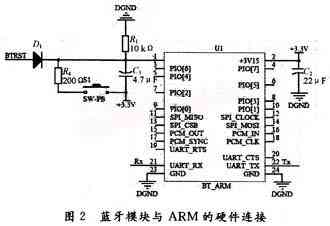 图2中C1和R3组成上电复位电路;S1为长开按钮,当S1按下时,实现手动复位;LPC2146的P0.16脚(BTRST)也可以通过D1二极管复位蓝牙模块。
